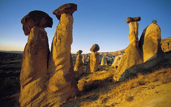 3. Tag: Kappadokien -Göreme -Cavusin Vulkanausbrüche, Wind und Wetter haben über Jahrhunderte eine mit bizarren Tuffsteingebilden durchzogene Landschaft geschaffen, die ihres gleichen sucht. Schon vor 2000 Jahren haben die Bewohner begonnen, Höhlensysteme und komplette unterirdische Städte mit beeindruckenden Kirchen in die weichen Steine zu graben. Das Göremetal ist mit seinen zahlreichen Höhlenkirchen eines der berühmtesten Orte in Kappadokien. Wir besichtigen das Freiluftmuseum von Göreme und die berühmten Höhlenkirchen mit deren biblischen Malereien. Anschließend besichtigen wir das Dorf Cavusin, eine Art Burgberg mit einer großen Höhlenkirche